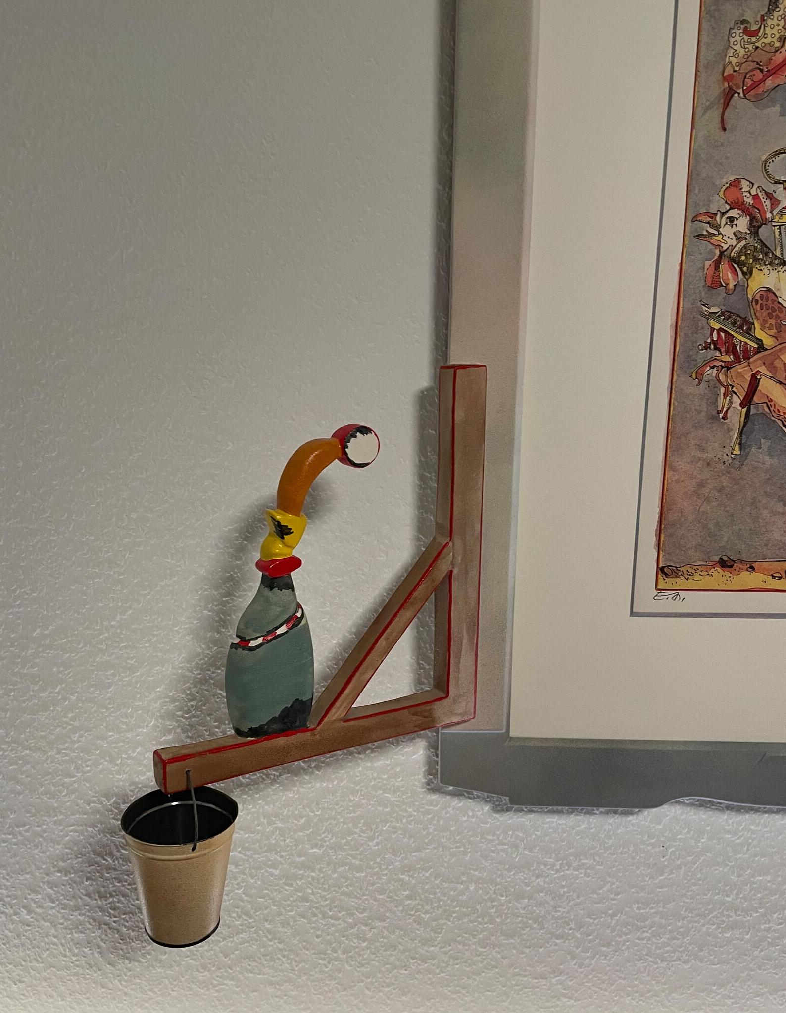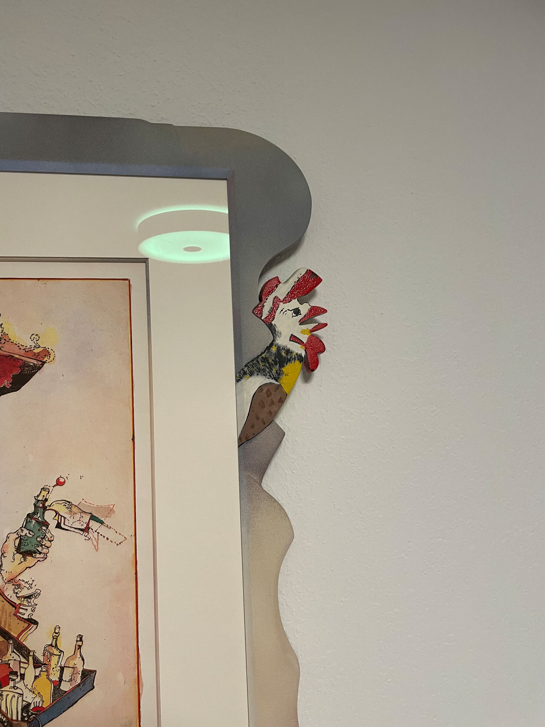 Der Rahmen schmückt das Bild mit mehreren individuellen Applikationen, passend zum Thema. Die Applikationen sind jeweils aus Holz, teils geschnitzt, teils gefräst, und in den Farben des Bilds angemalt und lackiert.